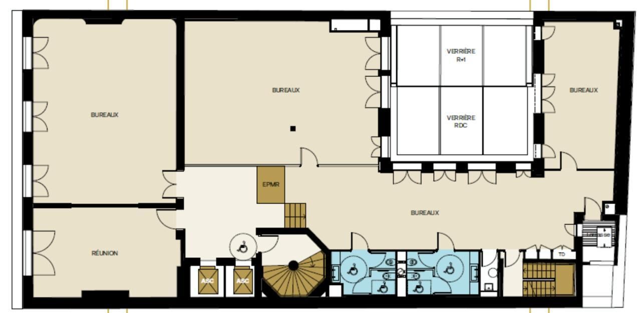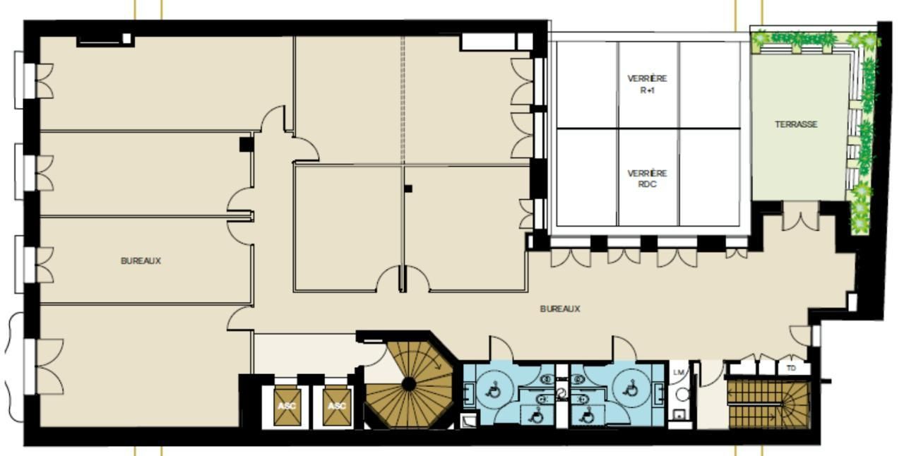 - Eléments architecturaux d'origine : bureaux patrimoniaux au R+1 dotés de moulures, parquets, cheminées et plafonds peints