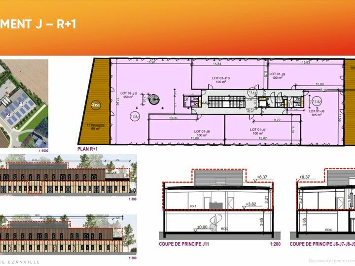 3 Plateaux de bureaux au 1er étage de 100 m² disponible.