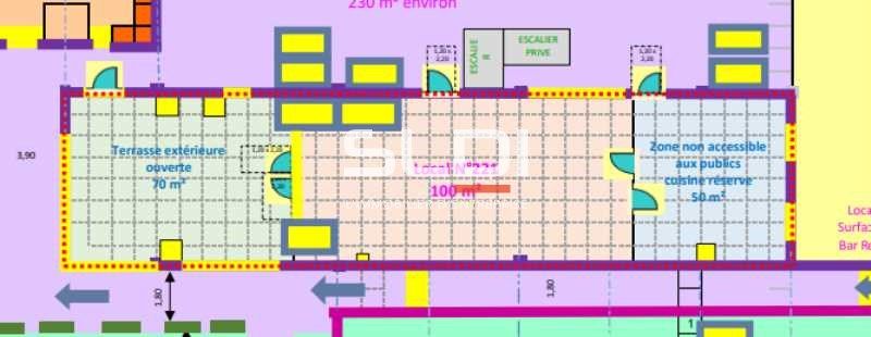 Nous vous proposons un local commercial de 150 m² brut de béton, composée d'une salle de 100 m², une pièce de 50 m² , non accessible aux public plus terrasse de 70 m² convient parfaitement à la restauration , bar à thème.