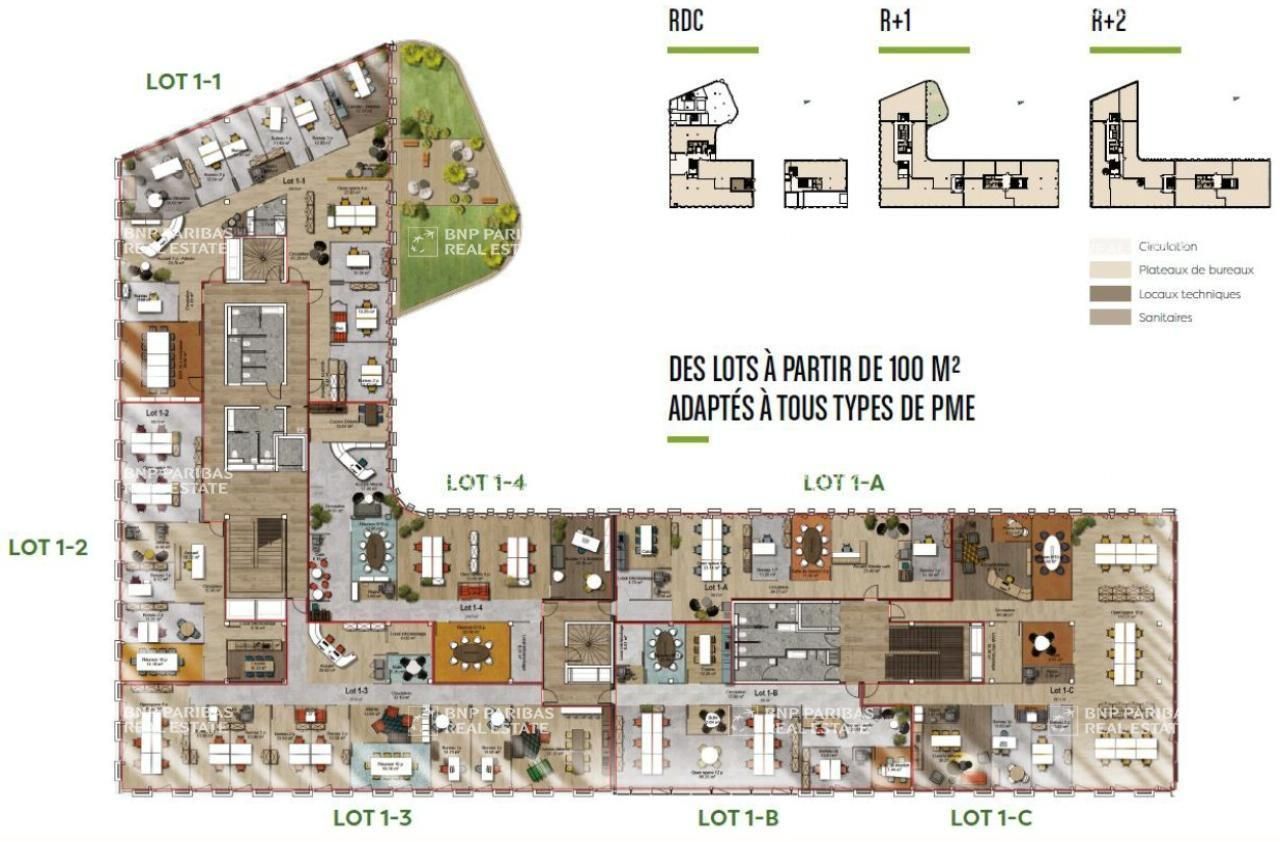 BNP PARIBAS REAL ESTATE vous propose, à la location, des locaux de bureaux neufs d’une surface totale de 3 358,98 m² environ divisible à partir de 152,19 m².