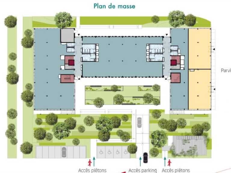 Environnement entièrement paysager avec un jardin central piéton végétalisé et arboré de 2ha.
